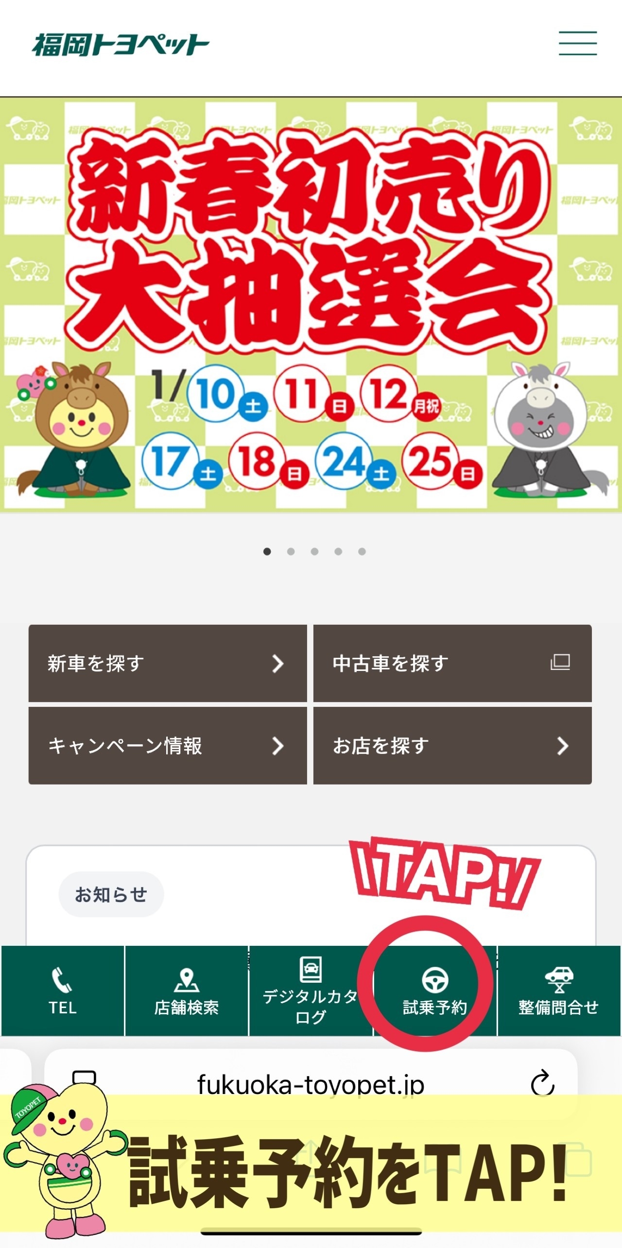 ①ホームページから「試乗予約」をタップ